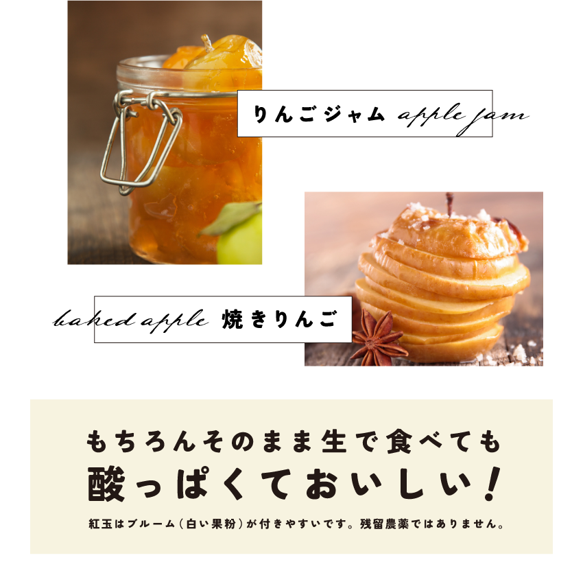 ※紅玉はブルームと呼ばれる白い粉がついています。りんご自身から発生しており、新鮮さを保つためのものです。残留農薬ではなく品種特性です。